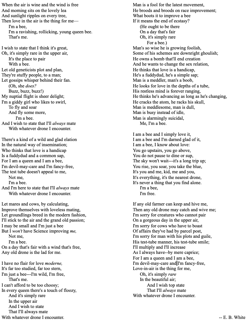 As I was doing this, I came across my favorite poem, “Song of the Queen Bee,” by E. B. White. I excerpted the poem back in February.
