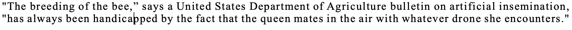 "The breeding of the bee,” says a United States Department of Agriculture bulletin on artificial insemination, "has always been handicapped by the fact that the queen mates in the air with whatever drone she encounters."